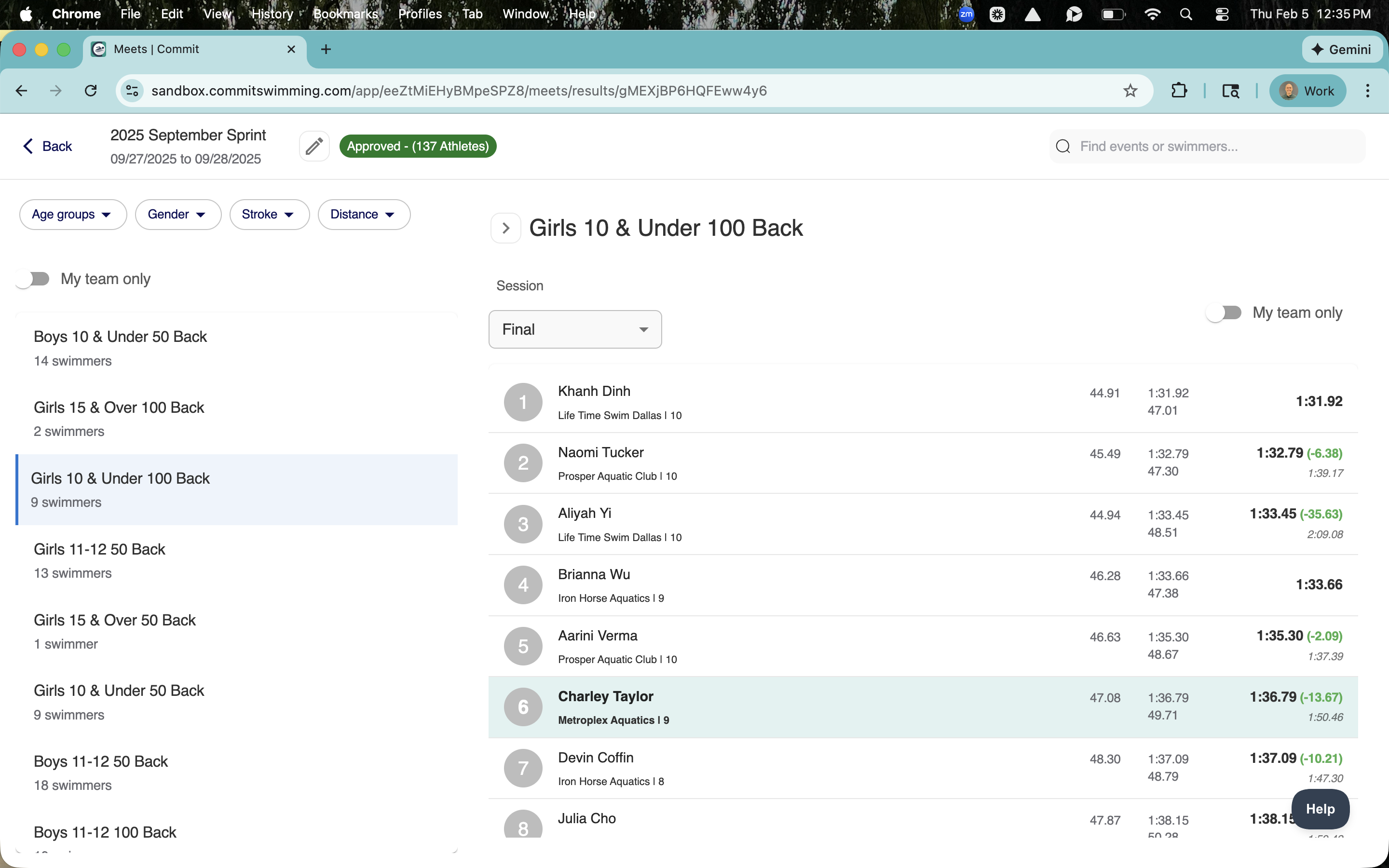 We’ve improved the user-friendliness of the meet interface. Now, you can easily click through events within a meet and see all of your team’s swimmers and their times at a glance.